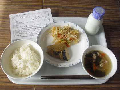 今日は、ごはん、牛乳、魚のごまだれかけ、野菜のからしじょうゆかけ