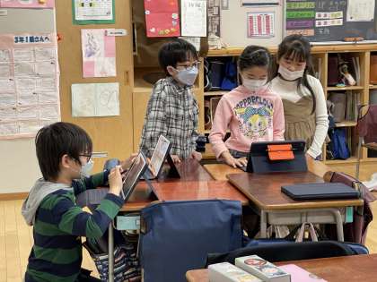 こちらのクラスでは、本番同様の練習をしていました。タブレットで撮影して、自分たちの話し方を客観的に見て、修正していました。