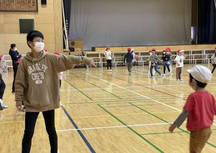 写真の背の高い人は、先生ではなく6年生です。先生のように1年生を見守っていました。
