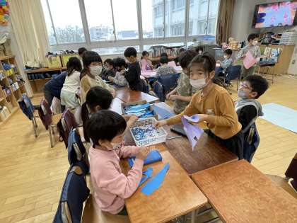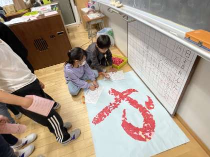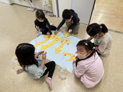 こちらは、「やまのしょうがっこう」の文字をちぎり絵で飾っているところです。