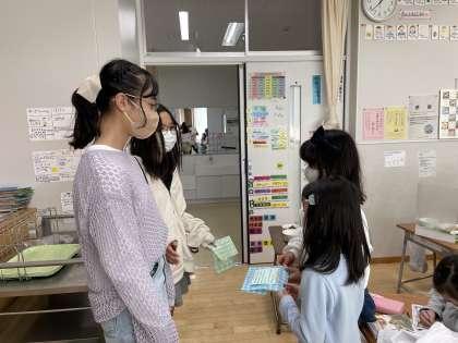 1枚目の写真は、6年生が作成した時間割カードのプレゼントを教室に届けてくれたところです。
