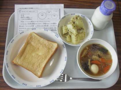今日は、シナモントースト、牛乳、肉団子入り春雨スープ、じゃがいもの香味あえです。