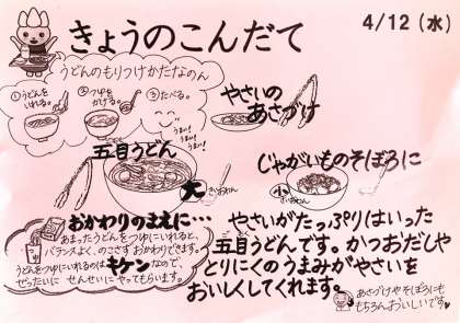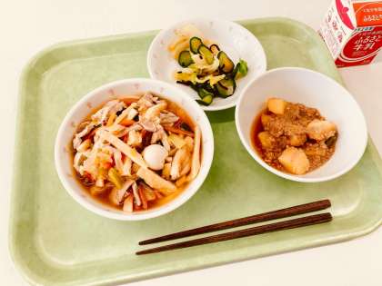 今日は、五目うどん、じゃがいものそぼろ煮、野菜の浅漬け、牛乳です。