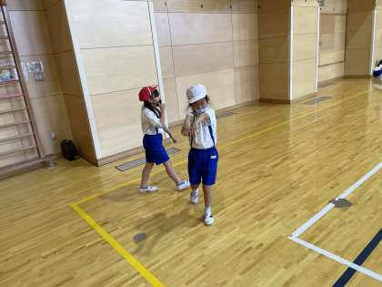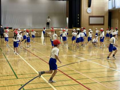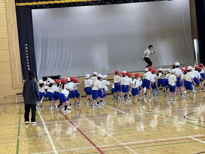 先生が「○○になれ!」と言うと、子供たちは、それを体で表現します。真ん中の写真は、何に変身しているのでしょう。