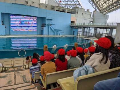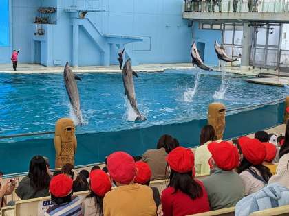 迫力満点のイルカたちのショーを間近で見てとても楽しそうでした!イルカショーの後は、広場でおいしいお弁当を食べ大満足でした。
