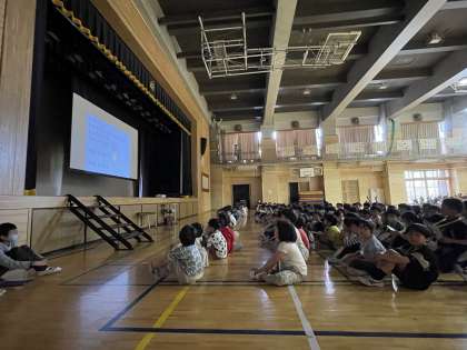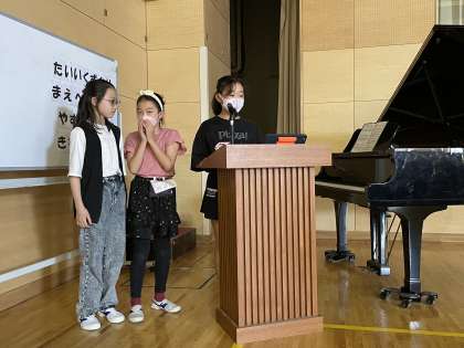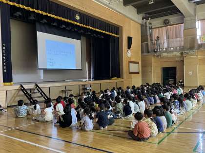 代表委員さんが、山野小クイズをしてくれました。「校歌の最初の歌詞はなんでしょう?」「1、みどり 2、あか 3、あお」など、1年生にも分かるような面白い問題を出してくれました。1年生のみんなは、とても楽しそうに答えていました。