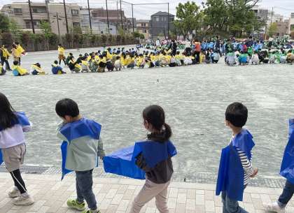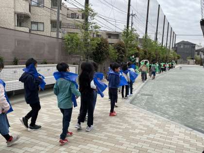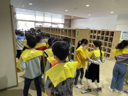 靴箱が混み合わないないように、放送で順番に案内しました。子供たちは、落ち着いて歩き、とてもスムーズに並ぶことができました。