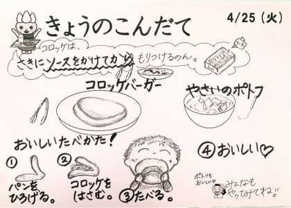 コロッケとパンは別々に食べるより、コロッケバーガーにした方が良いですね。バーガーにした方が、場が和むような気がします。コロッケのパリパリのころもが子どもたちに人気でした。ころもの食べ頃も大切です。