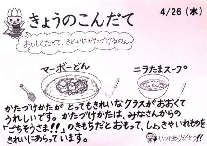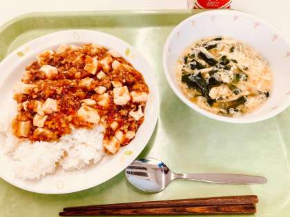 今日は、麻婆丼、にら玉スープ、牛乳です。