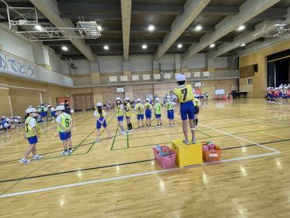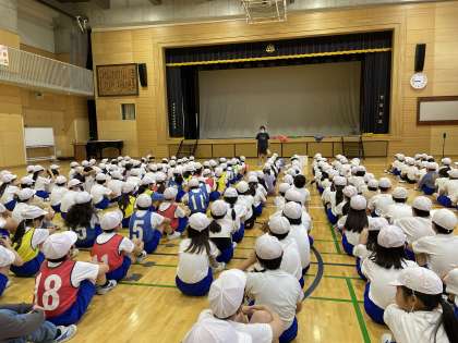 学年全員で行う「団結は力なり!わが城を守れ!」という競技のやり方を知りました。説明を聞いてから、実際に行いました。