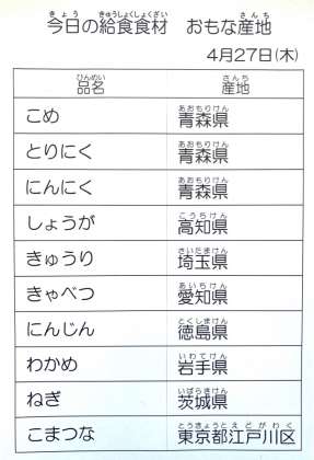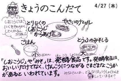 今日は、ごはん、鶏肉の塩麹から揚げ、野菜のナムル、豆腐のみそ汁、牛乳です。