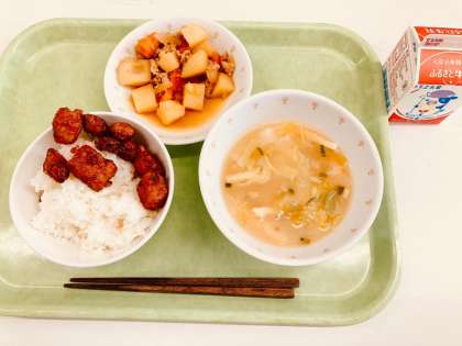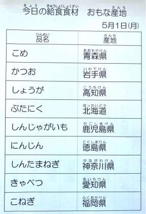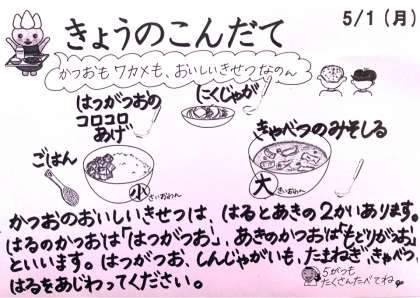 今日は、ごはん、初鰹(はつがつお)のコロコロ揚げ、肉じゃが、キャベツのみそ汁、牛乳です。