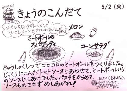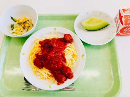 今日は、ミートボールのスパゲッティ、コーンサラダ、メロン、牛乳です。