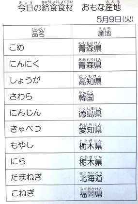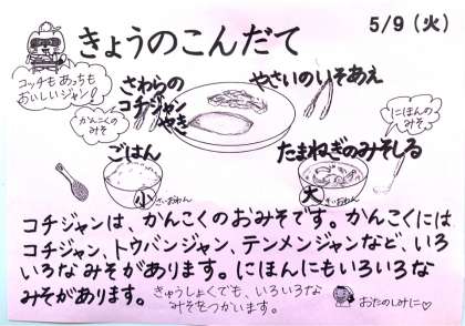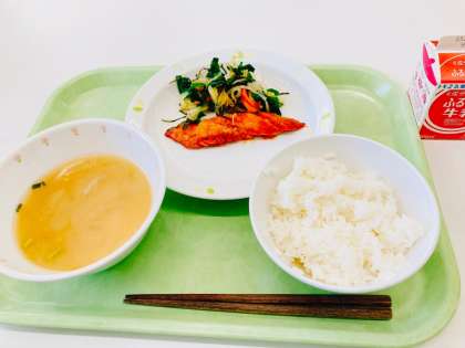 今日は、ごはん、鰆のコチジャン焼き、野菜の磯あえ、玉ねぎのみそ汁、牛乳です。