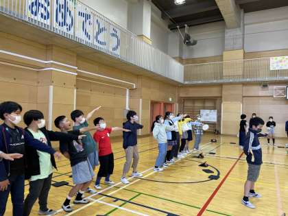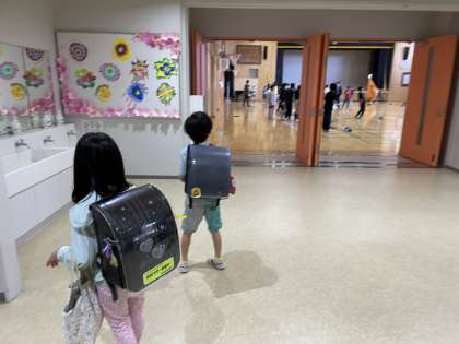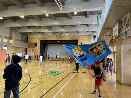 体育館から大きな声と太鼓の音が聞こえてきました。5、6年生の応援団が朝練習をしていました。各色の団旗がはためいて迫力満点です。山野小の名物、応援団。登校してきた子が憧れの眼差しで見ていました。