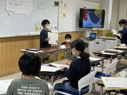 5年生の様子です。英語で自己紹介をしていました。しっかりと発音していました。こうした活動で、話すことに慣れていきます。聞いている子は、友達の名前と好きなものをプリントに記入していました。