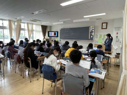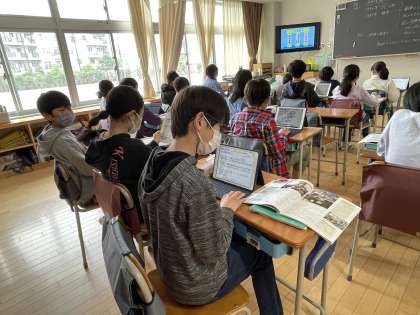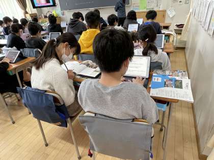 「日本国憲法」について学習していました。NHKの動画を見て学んでいました。分かったとをノートやタブレットに書いていました。得た知識をすぐにまとめていて、学習への意欲が素晴らしいと思いました。