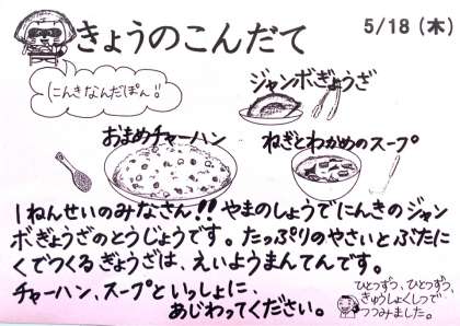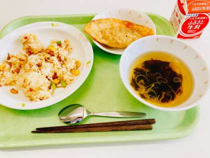 今日は、おまめチャーハン、ジャンボぎょうざ、ねぎとわかめのスープ、牛乳です。