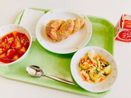 今日は、あげ!パン、ミネストローネ、チーズ入りカラフルサラダ、牛乳です。