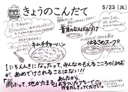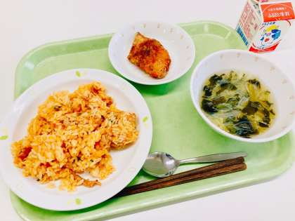 今日は、キムチチャーハン、青魚の南蛮漬け、春雨スープ、牛乳です。