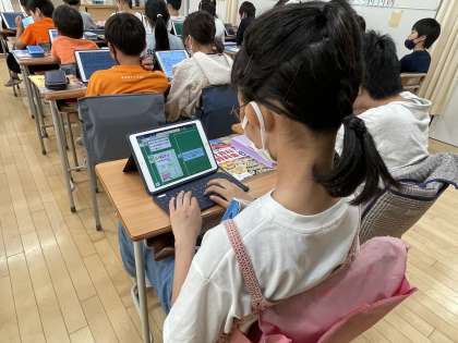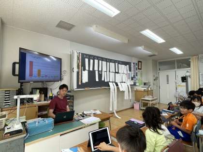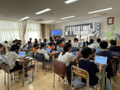 「選挙」について学習するのに、実際に選挙を体験していました。各党の「マニフェスト」をインターネットで見て、ロイロノートのアンケート機能を使って投票しました。いいなと思う政策を短冊に書き、黒板に貼りだして、理由もしっかり示していました。