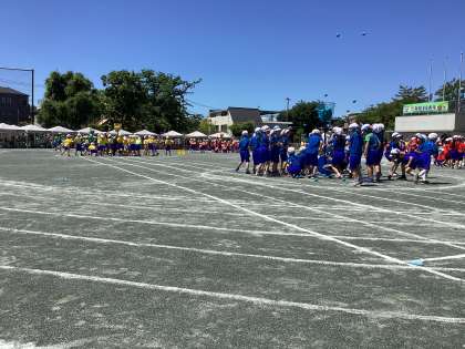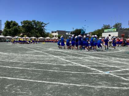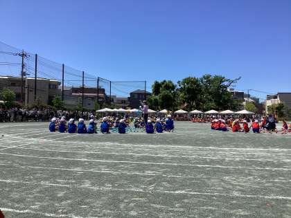 1年生のチェッコリ玉入れです。かわいいダンスの後は、カゴを目掛けて一生懸命に玉を投げます。さて、みんなで数えます。