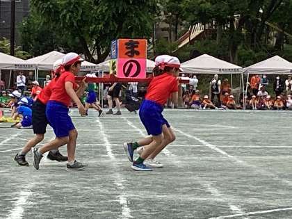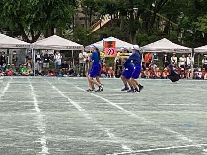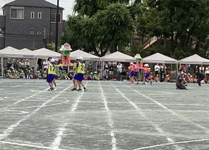 4年生「わっしょいリレー」です。落としてしまうとすぐに逆転されてしまうこの競技。最後は、アンカーによる接戦になりました。