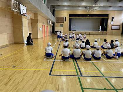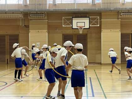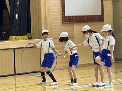 どうしたら速くくぐれるかグループで考えていました。声を掛け合って、協力して運動することも体育では大切な学びです。