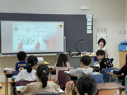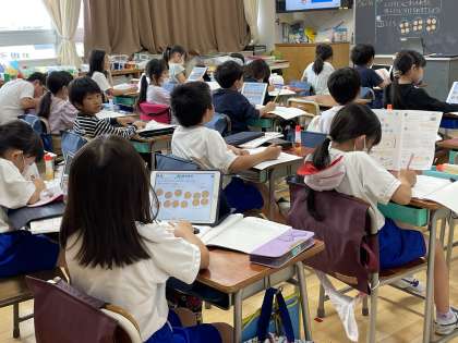 黒板には袋に同じ数すつのクッキーが入っている絵が掲示してありました。子供たちの手元にもタブレットで見られるようになっていました。わり算の意味を視覚で捉えて理解していました。