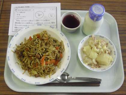 今日は、ソース焼きそば、牛乳、ジャーマンポテト、ぶどうゼリーです。