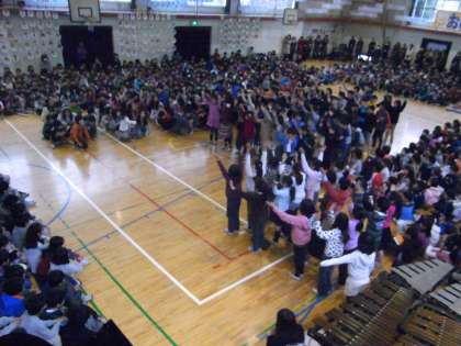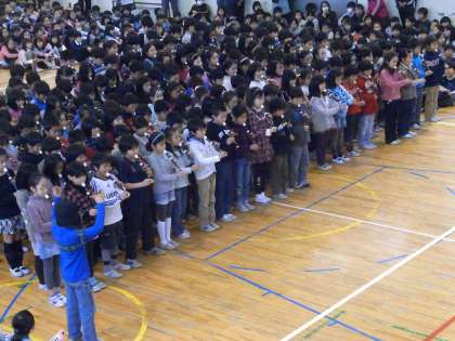 3年生はリコーダー合奏と合唱です。リコーダーの響きがきれいです。次に、児童会が考えた6年生クイズのコーナーがありました。3択クイズは、大いに盛り上がりました。ナイスアイデアです。4年生の出し物は、歌を織り交ぜた寸劇。これまたおもしろいアイデアで、会場が盛り上がりました。