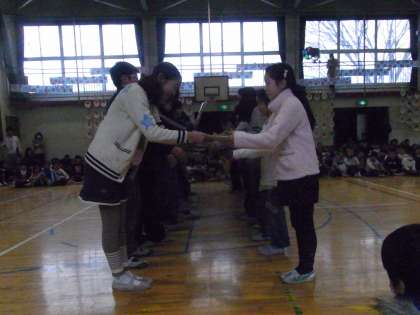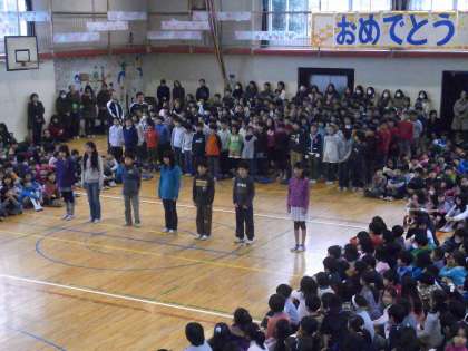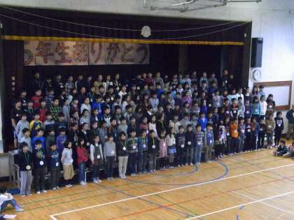 5年生は、6年生からしっかりとバトンを受け取るという決意に満ちた言葉と、合唱を披露してくれました。6年生は、じっとその表情を見ていました。あたかも、よろしく頼んだよ、とうったえかけているようでした。そして、6年生の合唱です。さすがです。1〜5年までがうっとりと聞いていました。そして、体育館の周りに立っていた先生たちの目には、きらりと光るものが…。委員会の引き継ぎ式をして、6年生を送る会は幕を閉じました。6年生からのバトンは、しっかりと5年生が責任をもって引き継いでいってくれるでしょう。