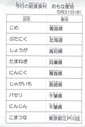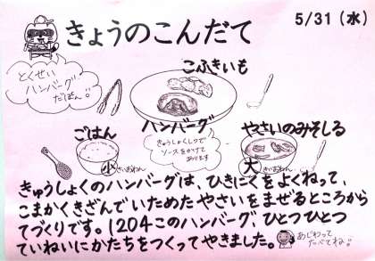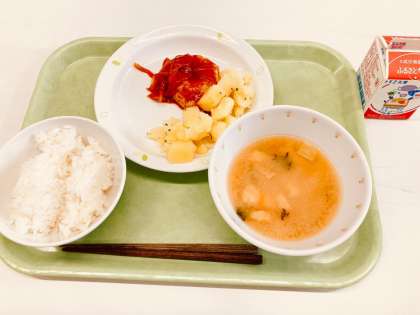 今日は、ごはん、ハンバーグ、粉ふきいも、野菜のみそ汁、牛乳です。