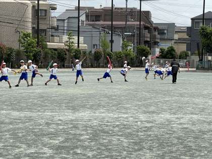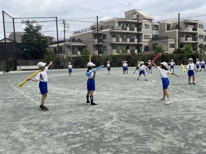 投げる運動をしていました。ロケット型のスポンジを遠くまで飛ばします。先生が「前の手を出して。」と投げるフォームのポイントを子供たちに伝えていました。体を意識するだけで、投げ方が変わり、体全体を使って投げていました。自分の体を上手に使いながら遠くまで飛ばして、気持ちよさそうでした。