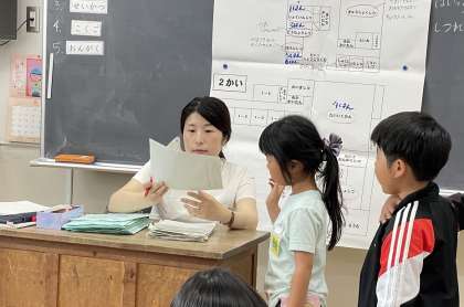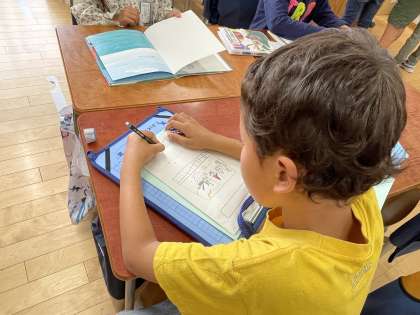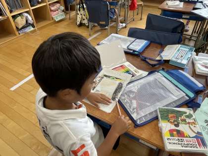 「学校たんけん」のふりかえりを書いていました。心に残ったことを絵や言葉で表していました。一生懸命仕上げて、先生に見てもらっていました。たくさん褒められて嬉しそうでした。