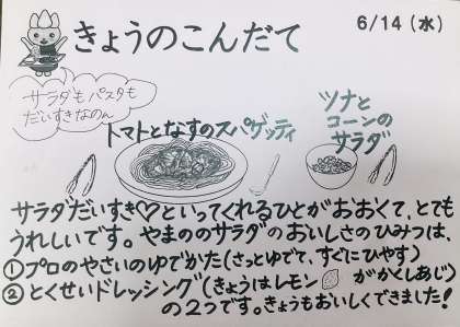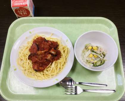 今日は、トマトとなすのスパゲッティー、ツナとコーンのサラダ、牛乳です。