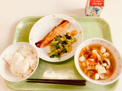 今日は、ごはん、鮭のねぎみそ焼き、キャベツのおひたし、けんちん汁、牛乳です。