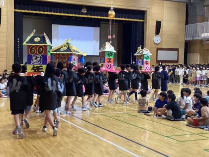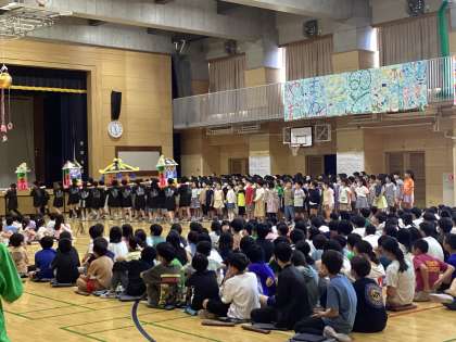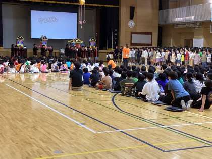 次に4年生。4年生と言えば!お神輿が登場し、そして、群読。山野小学校のことを読んでくれました。迫力ある発表にみんな引き込まれていました。