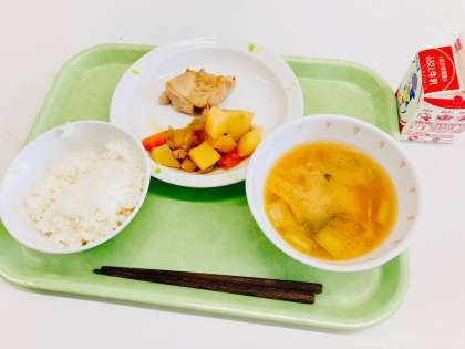 今日は、ごはん、鶏肉の梅麹焼き、肉じゃが、野菜のみそ汁、牛乳です。