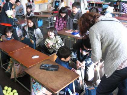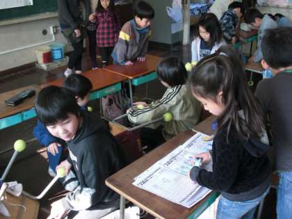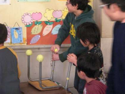 ”穴あきテニスボール”を今日は、6年生が1年生の各教室に出向いて