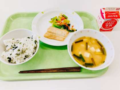 今日は、わかめごはん、太刀魚の香味焼き、野菜のからしあえ、ニラと豆腐のみそ汁、牛乳です。
