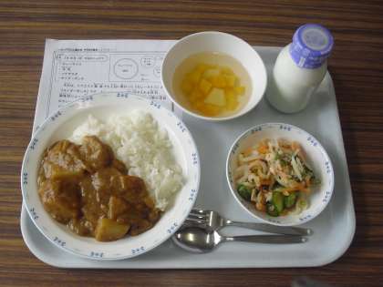 今日は、カレーライス、牛乳、ツナサラダ、サイダーポンチです。