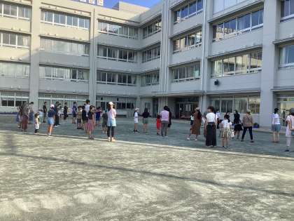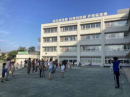 初日、山野小学校には100名弱の皆さんが参加してくれました。青空の下、生のラジオ放送を聴きながらみんなで体を動かして、体も心もほぐれました。