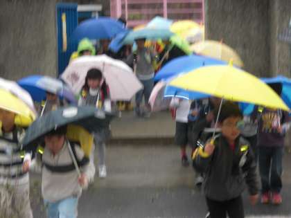 集団での下校三日目、雨の中の下校でしたが、しっかり並び、