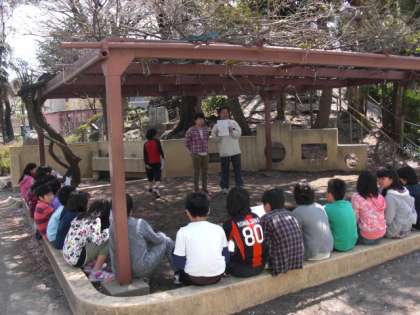 砂場の縁に全員が腰掛け、代わる代わる自己紹介する活動です。