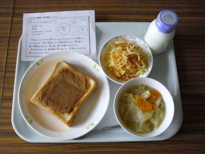 今日は、きな粉バタートースト、牛乳、じゃがいものハニーサラダ、ヌードルスープです。