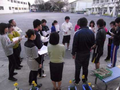 山野小学校では、子どもたちに長縄とびにチャレンジさせていきます。子どもたちが上手に跳べるようになるためには、先生たちが長縄跳びのポイントについて知っていることが大事です。そのために、今日は長縄跳び講習会を富田先生が開いてくれました。縄を回すポイント、跳ぶ人の入り方など、丁寧に先生方に教えてくれました。