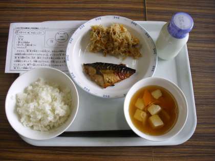 今日は、ごはん、牛乳、魚の七味焼き、切り干し大根の煮付け、けんちん汁です。