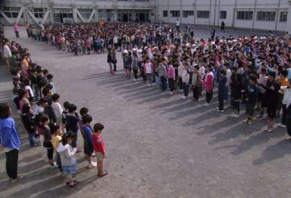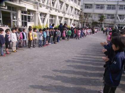 今日の全校朝会から、1年生も一緒に入ります。今日はその前に、1年生と2〜6年生が対面式を行いました。今日から一緒に朝会や集会をやるから、お互いよろしくお願いしいますという会です。大勢の子どもたちを目の前に、1年生はちょっとどぎまぎしていましたが、すぐに慣れたようでした。901名全員での朝会のスタートです。