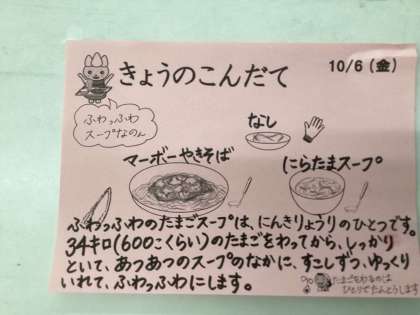 今日の給食は、マーボーやきそば、にらたまスープ、なし、牛乳です。まずは、ふわっとろ の卵とシャキッとしたにらの食感を堪能した後、マーボーやきそばをいただきました。豆腐 と麺と麻婆のあんが三位一体となり口に広がりました。麻婆豆腐とご飯の相性もいいけど、 やきそばも相性抜群なことを発見しました。マーボーやきそばもイケメンです!!